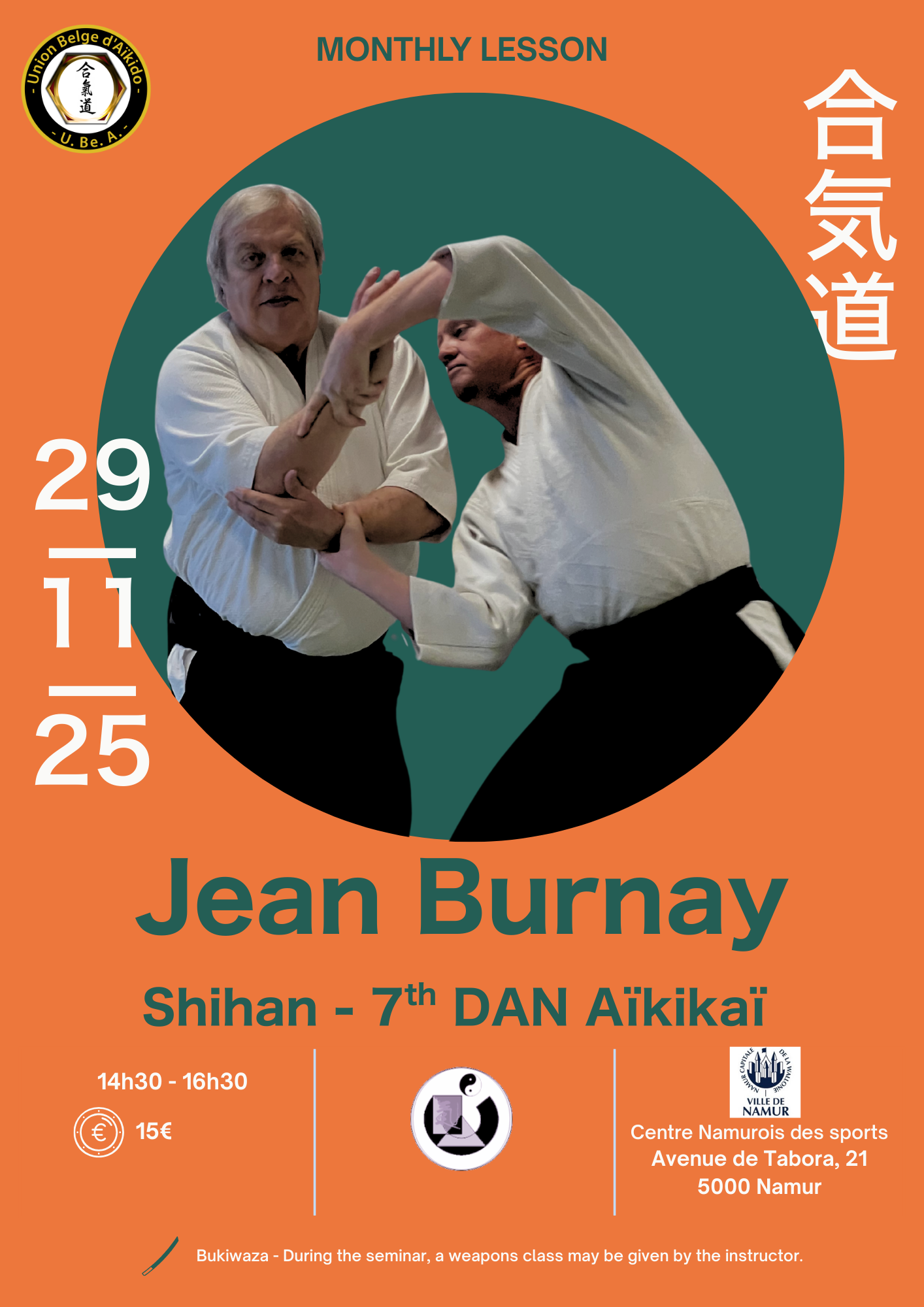 Aikido Monthly class Class led by Jean BURNAY Shihan + Add to Google Calendar + iCal / Outlook export Date 29 11 2025 Time 14 h 30 min - 16 h 30 min Tarif 15.00€ Plus d\'infos Affiche Labels UBEA Lieu Centre Namurois des Sports avenue de Tabora, 21 5000 Namur Catégories UBEA Organisateur Jean Burnay Affiche Share this event