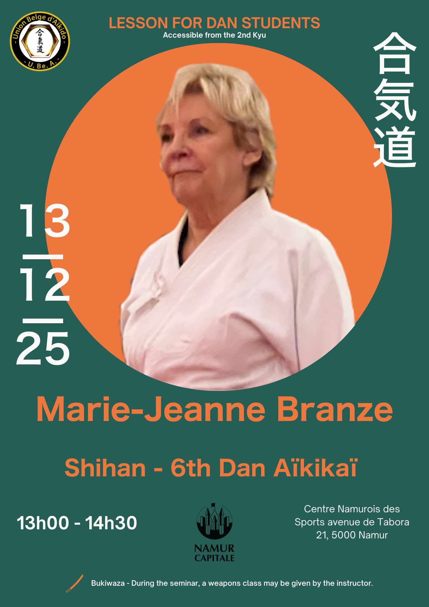 DAN Course DAN course led by Marie-Jeanne BRANZE Shihan. + Add to Google Calendar + iCal / Outlook export Date 13 12 2025 Expired! Time 13 h 00 min - 14 h 30 min Plus d\'infos Affiche Labels UBEA Lieu Centre Namurois des Sports avenue de Tabora, 21 5000 Namur Catégories UBEA Affiche Share this event